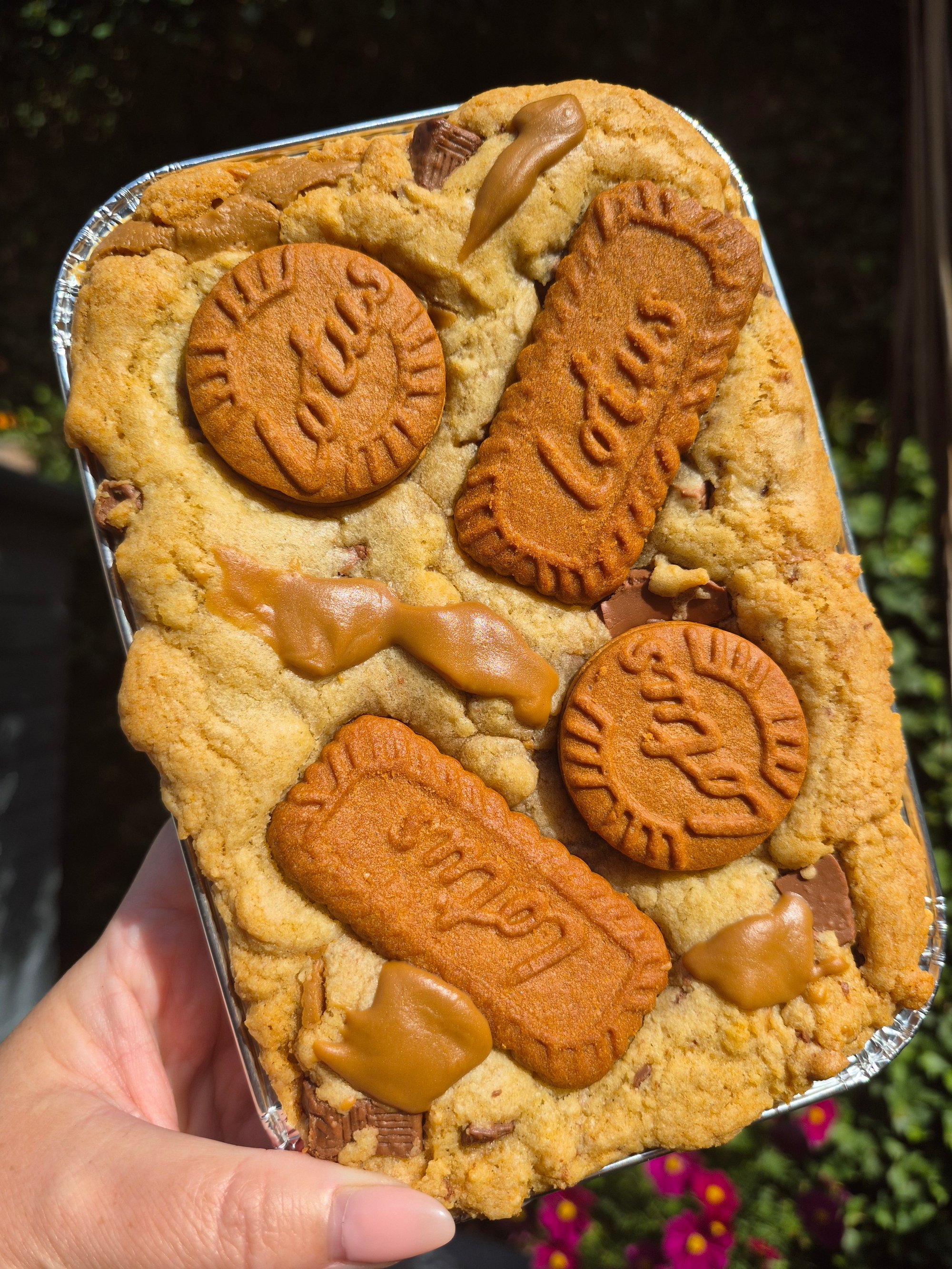 A milk chocolate chunk cookie bar stuffed with Biscoff spread and topped with Lotus Biscoff Biscuits.