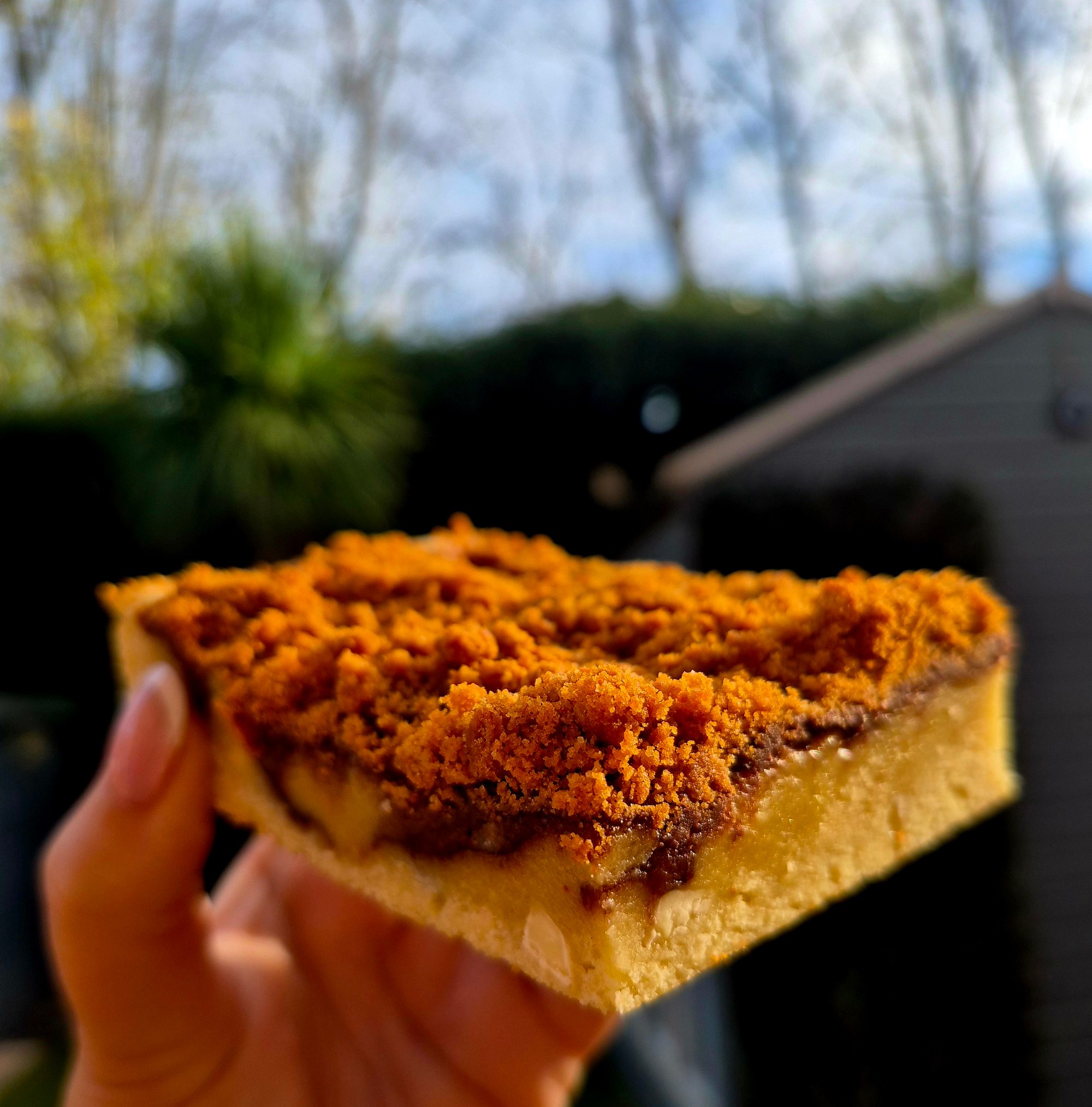 Blondie packed with white chocolate chunks, swirled with chocolate orange spread and topped with Lotus Biscoff crumbs.