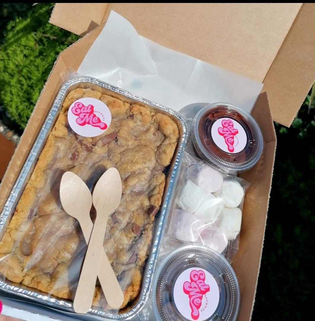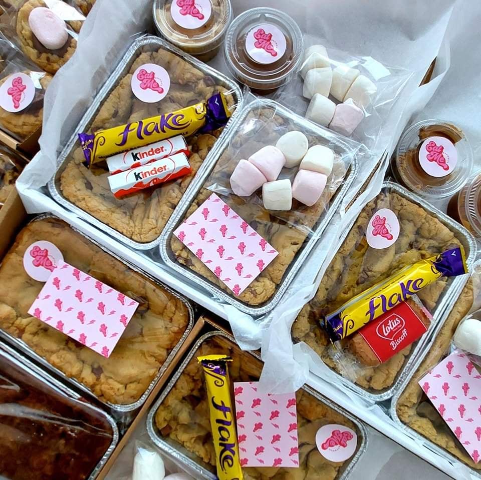 Your box will contain a 7x5" 330g tray of part baked milk chocolate chunk cookie dough. Marshmallows, sauce of your choice and a Cadbury Little Dairy Milk Bar.